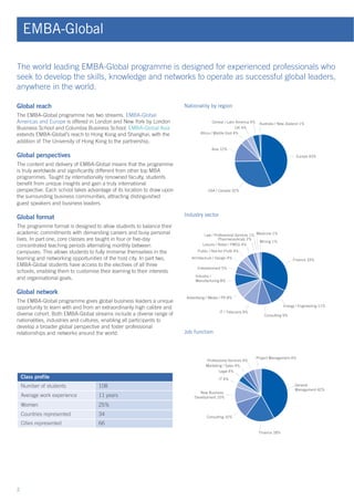 The document provides information about the EMBA-Global programme, which is a partnership between London Business School, Columbia Business School, and The University of Hong Kong. It offers two streams - EMBA-Global Americas and Europe, and EMBA-Global Asia. The programme aims to give experienced professionals skills and networks to operate as global leaders. It features a global curriculum taught by renowned faculty across campuses, allowing students to balance their studies with careers through concentrated monthly classes. The programme brings together a diverse international network of business professionals.