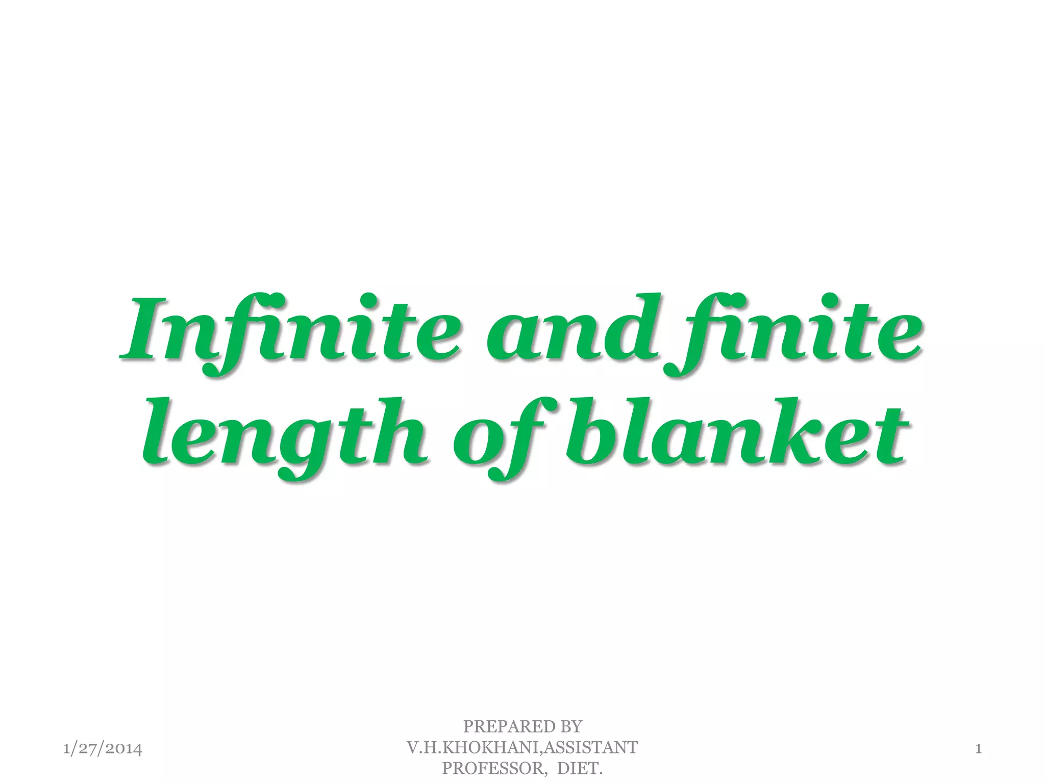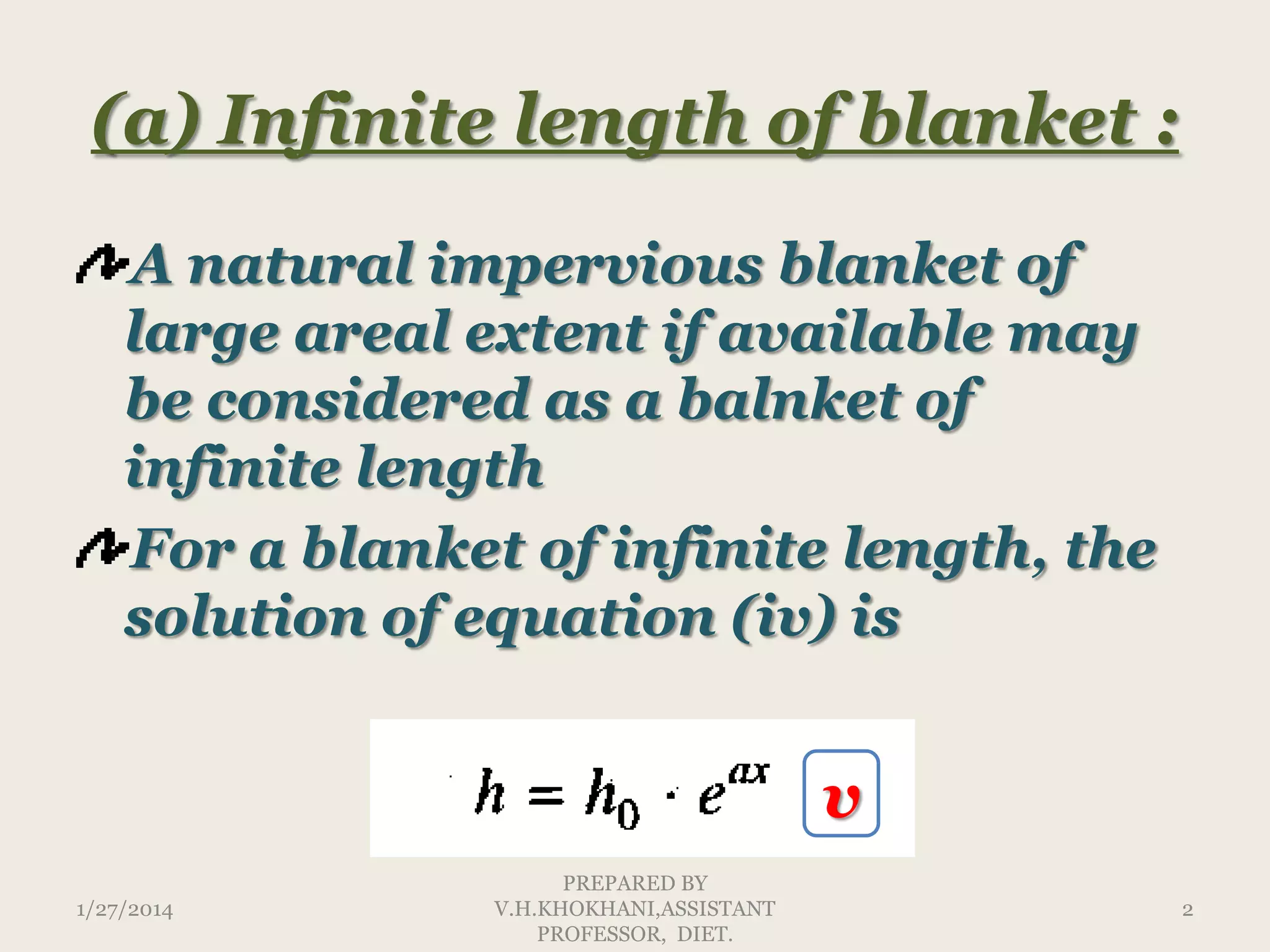 The document discusses the concepts of infinite and finite lengths of blankets in relation to hydrological engineering, particularly focusing on the loss of head through these blankets and calculating expressions for equivalent resistance. It provides equations to measure the efficiency of blankets and includes sample calculations for different blanket lengths to determine reductions in seepage discharge. The analysis aims to find the optimal length of blankets to effectively manage water flow and head loss.