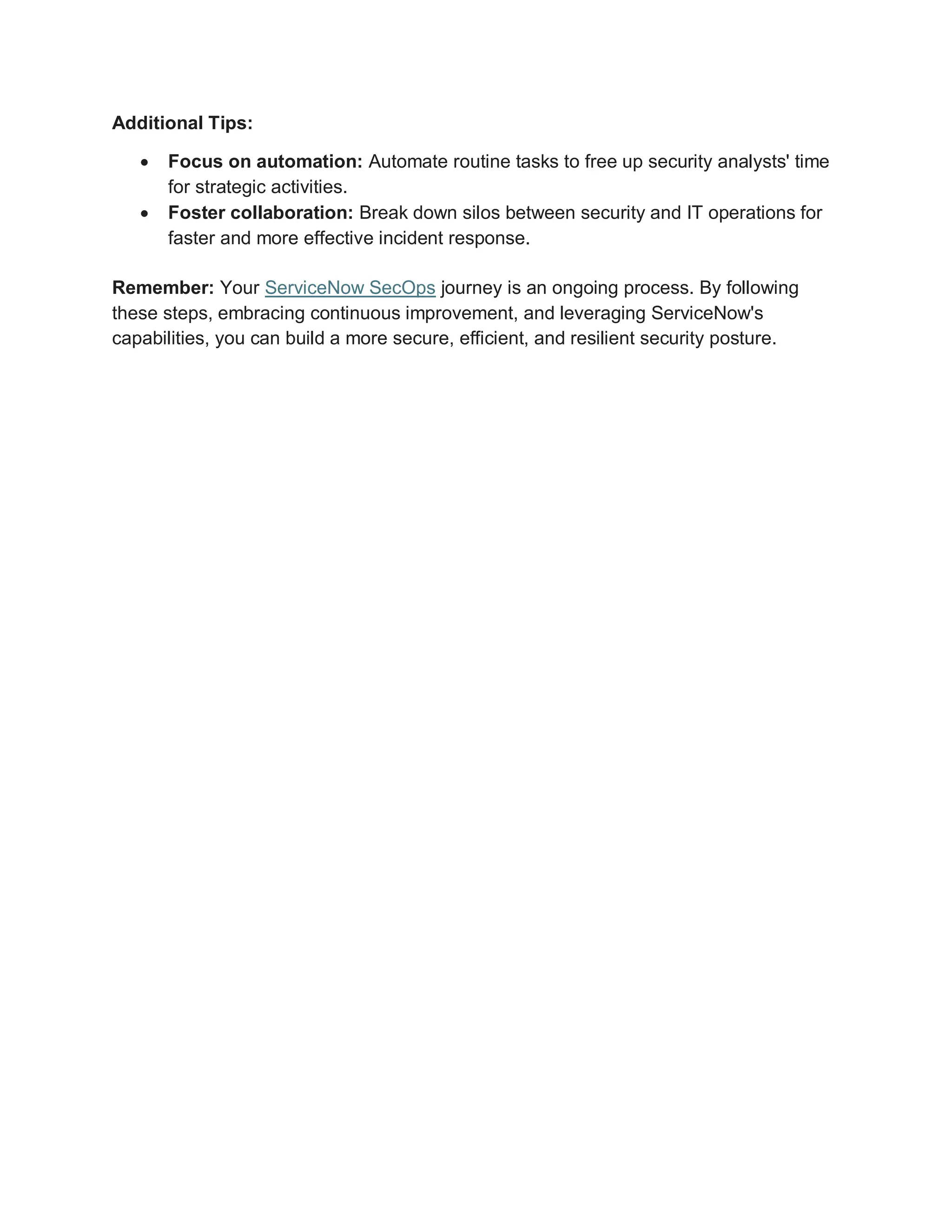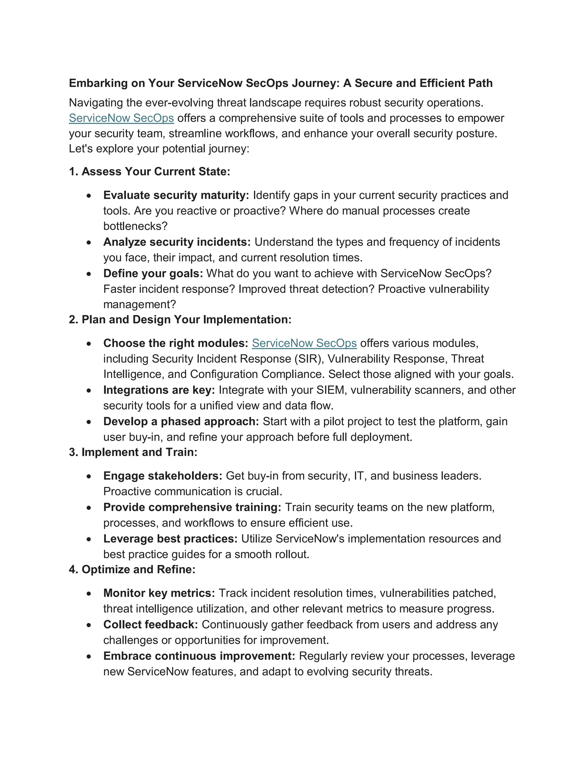The document outlines a structured approach to implementing ServiceNow SecOps for improving security operations amidst evolving threats. It emphasizes assessing current security practices, planning implementation, engaging stakeholders, training teams, and continuously optimizing processes. Key recommendations include focusing on automation and fostering collaboration between security and IT operations.