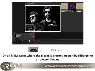The document describes how to embed the RITM music player on external websites to advertise and sell music outside of the RITM platform. It instructs users to copy the embed code from RITM pages with the player, paste it onto their own website or blog, and earn visibility, introduce playlists, and increase sales through the embedded player.