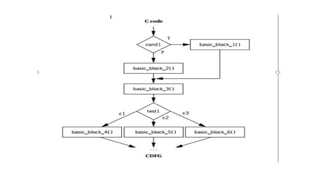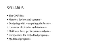 The document outlines a syllabus for an embedded computing platform design course, covering topics such as CPU and memory systems, performance analysis, program models, and optimization techniques. It details the components necessary for writing embedded programs, including state machines and queues, as well as the importance of program validation and testing methodologies. Additionally, it emphasizes the significance of optimizing both energy consumption and program size for efficient embedded system design.