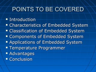 This document discusses embedded systems and their applications. It begins with an introduction to embedded systems, their characteristics, components and classifications. It then provides examples of applications for embedded systems like MP3 players, phones, medical devices and more. One specific application discussed is a temperature programmer using a microcontroller and digital temperature sensor. The document concludes by noting how embedded systems have become essential in many portable devices and applications due to their reliability, portability and economic benefits.