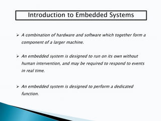 Embedded systems are integrated hardware and software components designed to perform dedicated functions without human intervention, often requiring real-time responses. They vary in applications from automotive to medical, facing constraints like size, power efficiency, and environmental durability. The design process involves models such as waterfall and spiral, focusing on architecture creation, implementation, testing, and maintenance.