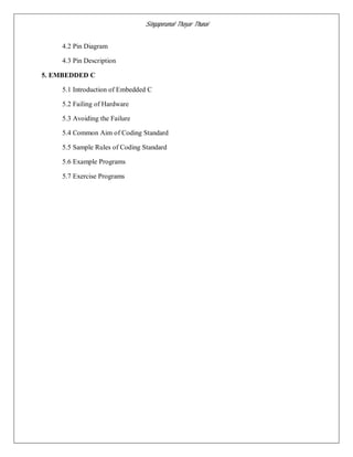The document provides an overview of embedded systems and their components. It discusses embedded hardware such as microcontrollers and microprocessors. Specific microcontrollers like the 8051 and PIC are examined in terms of their features, pin diagrams, and basic components. The hardware design of embedded systems including power supply, signal generation, and peripheral integration is also covered. Programming embedded systems in C and example programs are outlined.