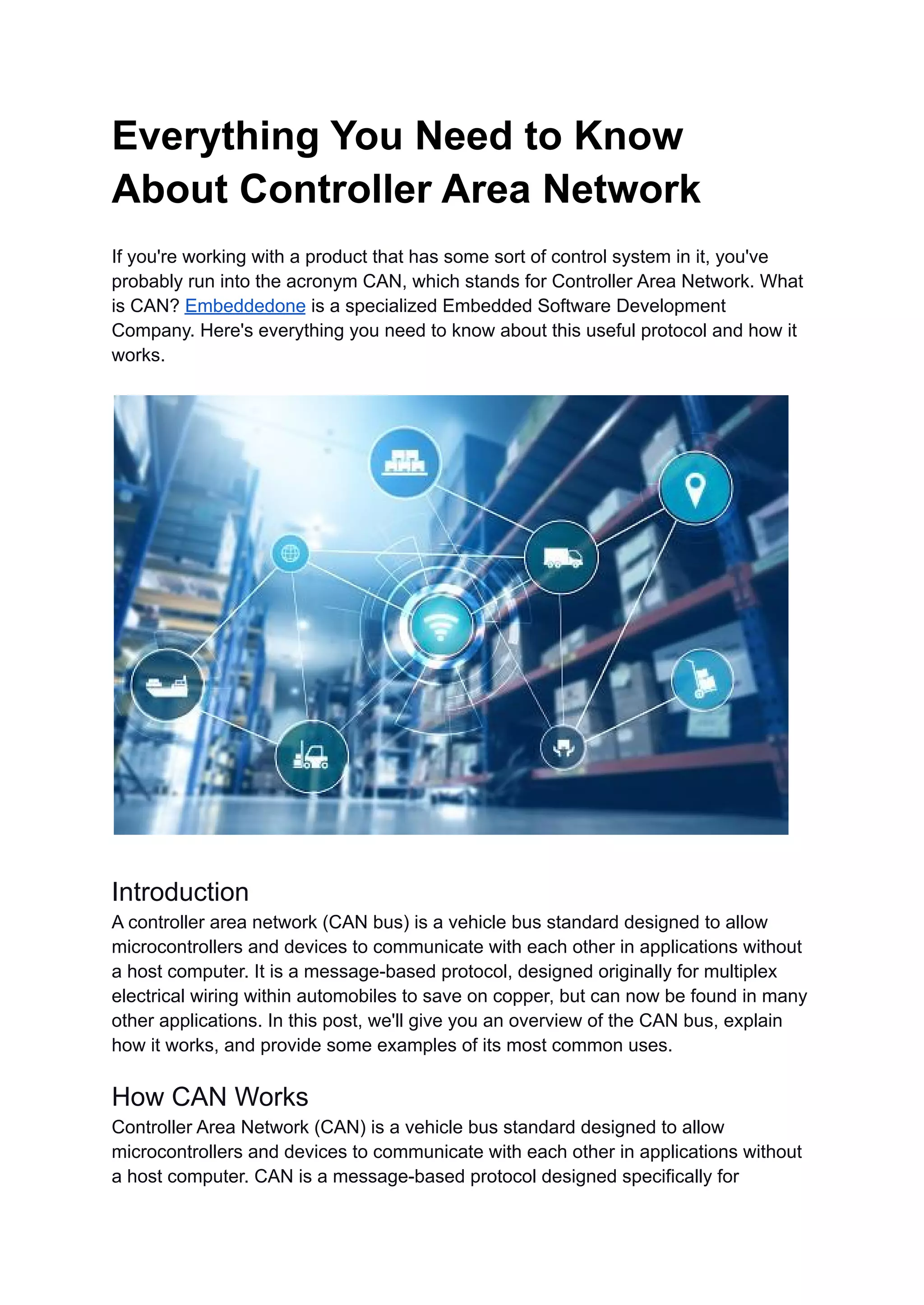 The document provides an overview of the Controller Area Network (CAN), a vehicle bus standard that enables communication between microcontrollers and devices without a host computer. It discusses the protocol's history, advantages, various message types, and comparisons to Ethernet, emphasizing its applications across the automotive and industrial sectors. The document highlights the CAN bus's versatility, fault tolerance, and efficiency in facilitating real-time data exchange.