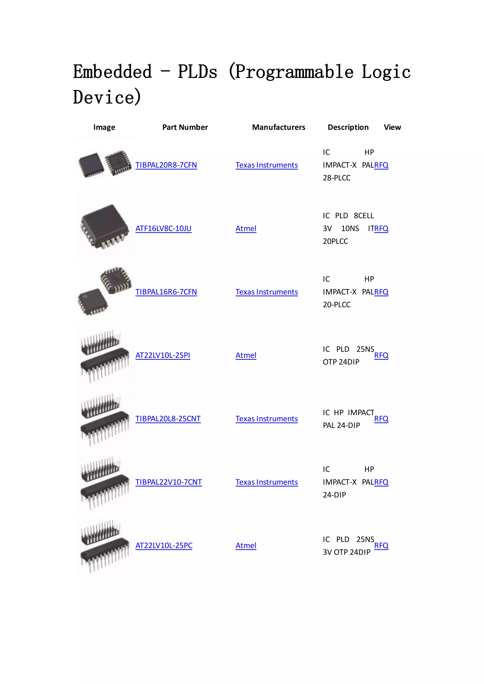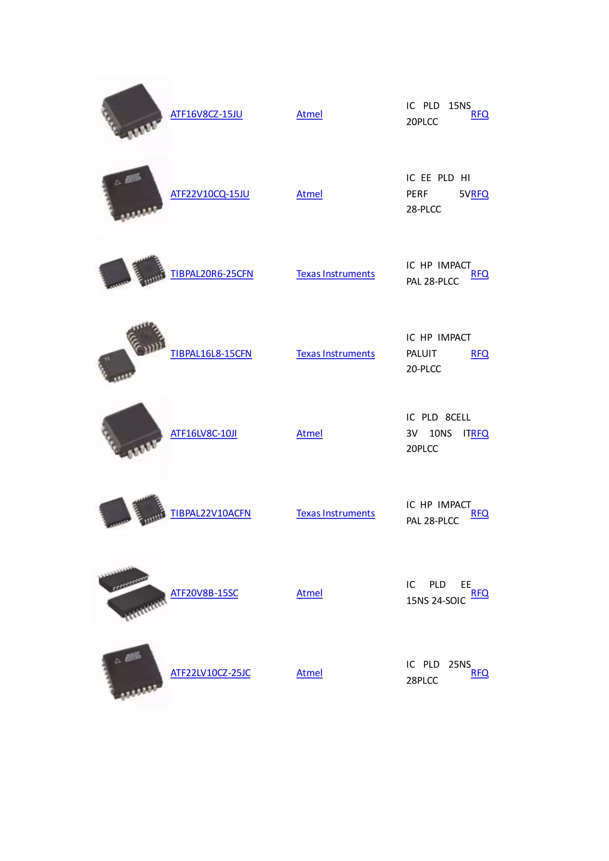 The document lists various programmable logic devices (PLDs) and their specifications from manufacturers such as Texas Instruments and Atmel, detailing part numbers, descriptions, and performance characteristics. It includes information on device types, features like macrocell count, speed specifications, and packaging options. Additionally, there is a brief mention of company information, support channels, and inquiry forms for product quoting.