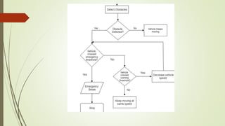 The document discusses the development of a lidar-based obstacle detection system integrated with emergency brake assistance, aimed at enhancing autonomous RC vehicles to prevent accidents. It outlines the design process, hardware components, software analysis using ROS and Python, and provides simulations and results for different scenarios. Future enhancements include integration with advanced driver assistance systems (ADAS) and weight reduction for the RC model car.