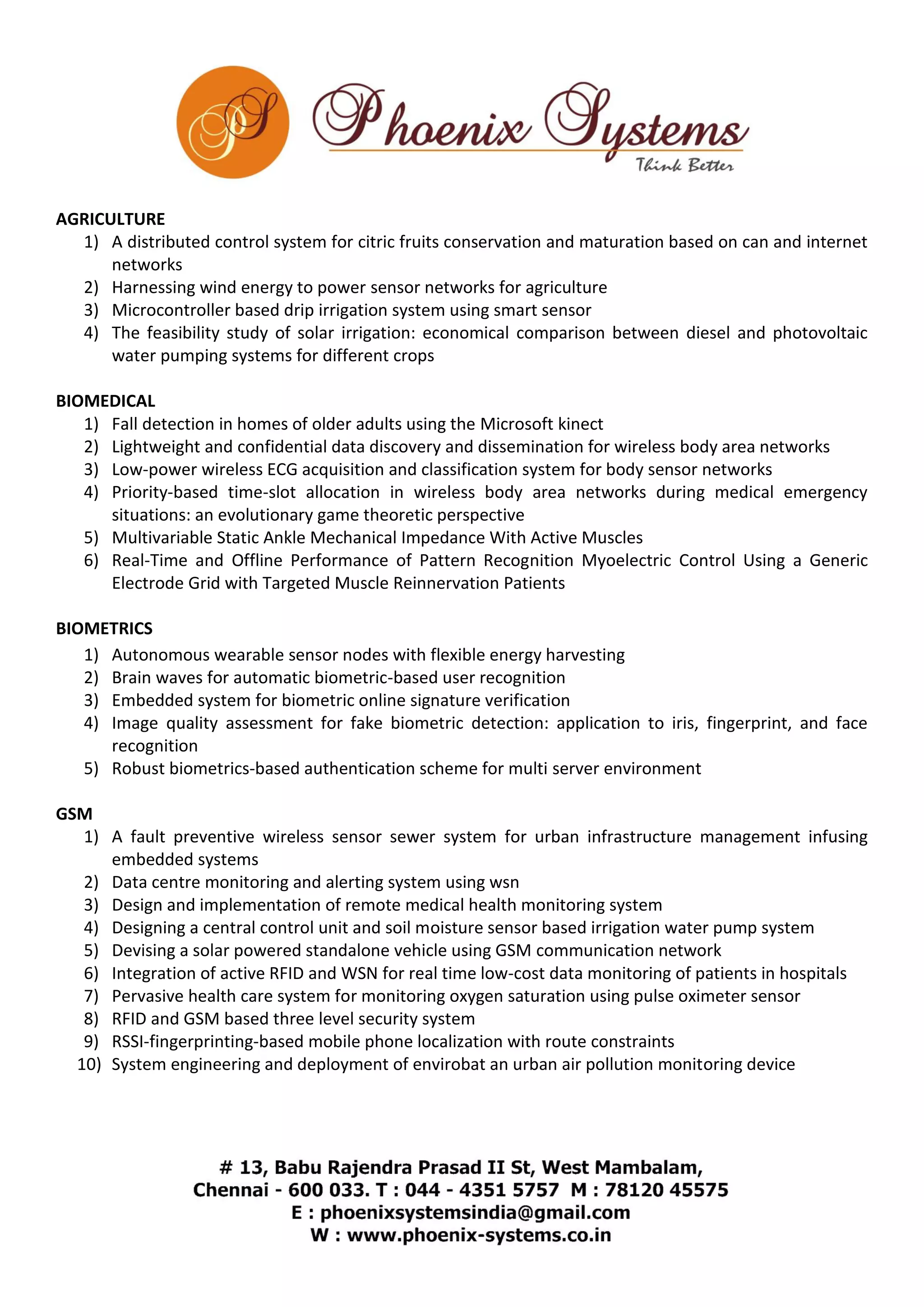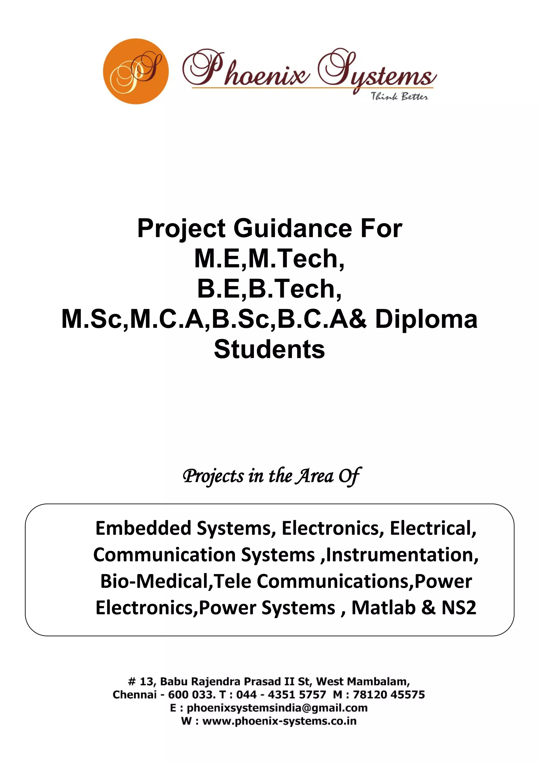 The document provides a comprehensive list of project guidance for various student programs, covering topics in embedded systems, electronics, and renewable energy systems. It includes specific project titles across numerous fields such as biomedical, telecommunications, and robotics, with a focus on practical applications and innovative solutions. For further information, contact details and a website are provided.