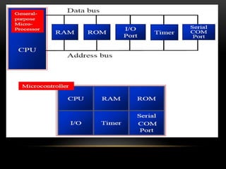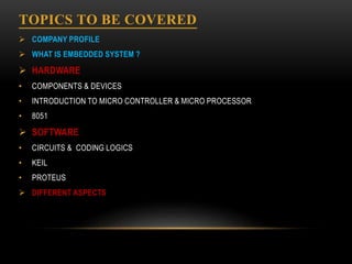 This document provides a summary of a practical training seminar report on embedded systems conducted at CMC Academy in Jaipur. It discusses the company profile of CMC Academy, provides definitions and comparisons of microprocessors and microcontrollers. It also describes some common electronic components used in embedded systems like resistors, LEDs, transistors, integrated circuits. Programming concepts for 8051 microcontrollers like I/O ports, timers and interrupts are explained. The document concludes by noting the widespread use of embedded systems in appliances, vehicles, medical devices and more.