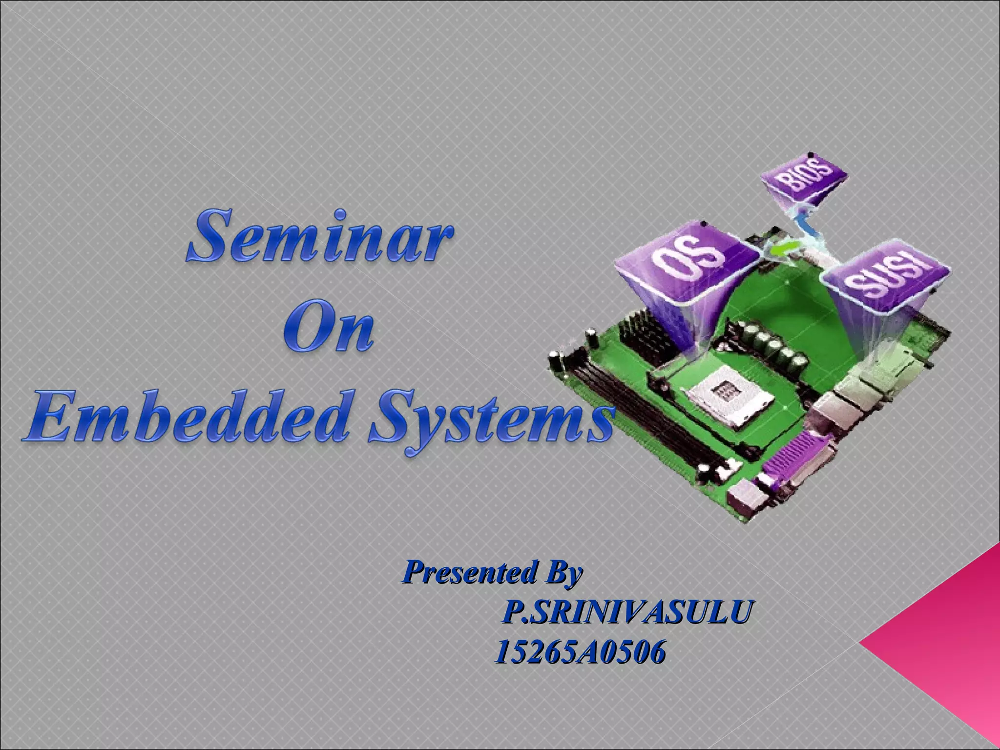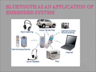 This document discusses embedded systems. It defines an embedded system as a special purpose computer used inside devices. Embedded systems have several key components: embedded hardware like microcontrollers, embedded operating systems, device drivers, and communication stacks. Challenges in developing embedded systems include low cost, high performance, and efficiency. Examples of applications are appliances, communication equipment, transportation systems, factory automation, and medical devices. Future trends include adaptive cruise control, telemedicine, security, telematics, and Bluetooth applications.
