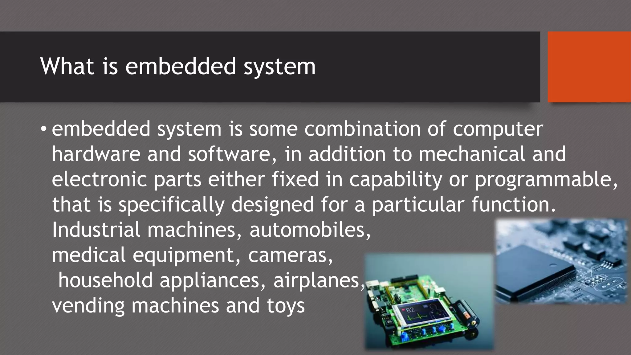 The document provides an introduction to embedded systems, covering their definition, components, and applications across various industries. It explains the distinction between microcontrollers (MCUs), microprocessors (MPUs), and field-programmable gate arrays (FPGAs), highlighting their architectural differences and use cases. Additionally, it discusses the classification of embedded systems, including stand-alone, real-time, and networked systems, as well as the concept of the Internet of Things (IoT).