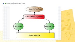 This document discusses embedded systems and provides information about careers in the embedded industry. It defines embedded systems and gives examples like washing machines and traffic lights. It also lists the main components of microcontrollers like processors, memory, timers, and I/O modules. The document outlines skills needed for embedded software engineers like C programming and knowledge of microcontroller manufacturers and components. It discusses challenges in embedded systems like performance, cost, size, and power consumption. Finally, it provides tips for starting a career in embedded systems.