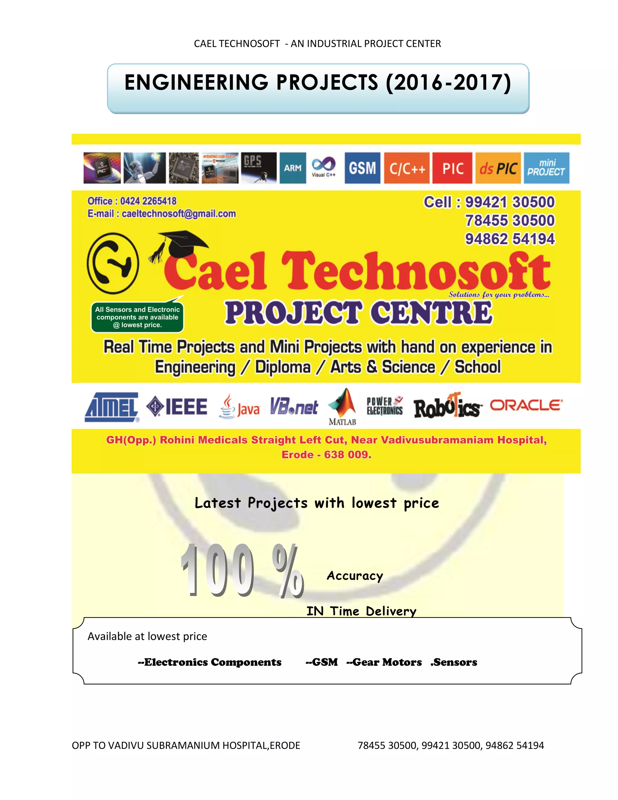 Cael Technosoft is an industrial project center in Erode offering engineering projects with a focus on electronics, embedded systems, and various technological solutions. They provide a wide range of projects at competitive prices, including innovations in robotics, IoT, and smart systems from 2016. Contact information and project details can be found through their various communication channels.