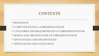 Embedded systems are custom computer systems designed for specific control functions within larger mechanical or electronic systems. They have specialized processors optimized for their dedicated functions and operate under defined constraints. This document categorizes embedded systems as stand-alone, real-time, or networked. It describes common hardware components like processors, memory, I/O devices, and communication interfaces. Examples of embedded system applications include consumer electronics, medical devices, telecommunications, and industrial automation.