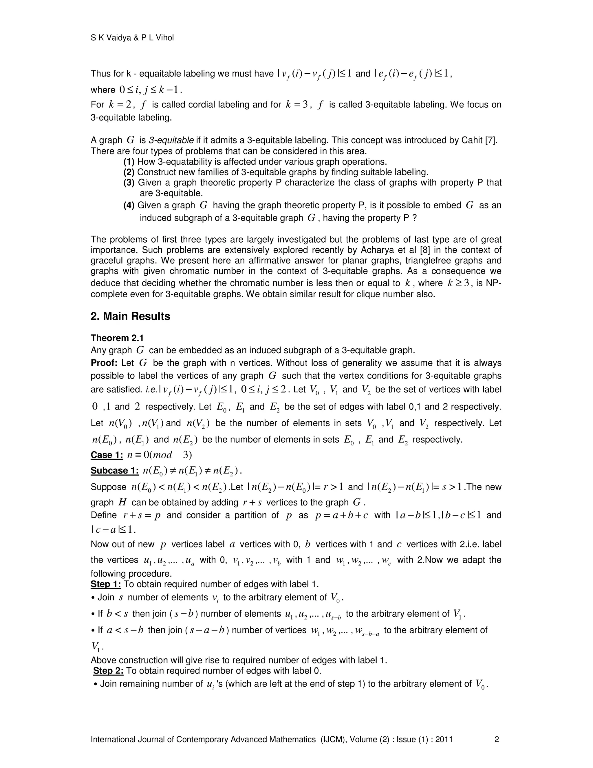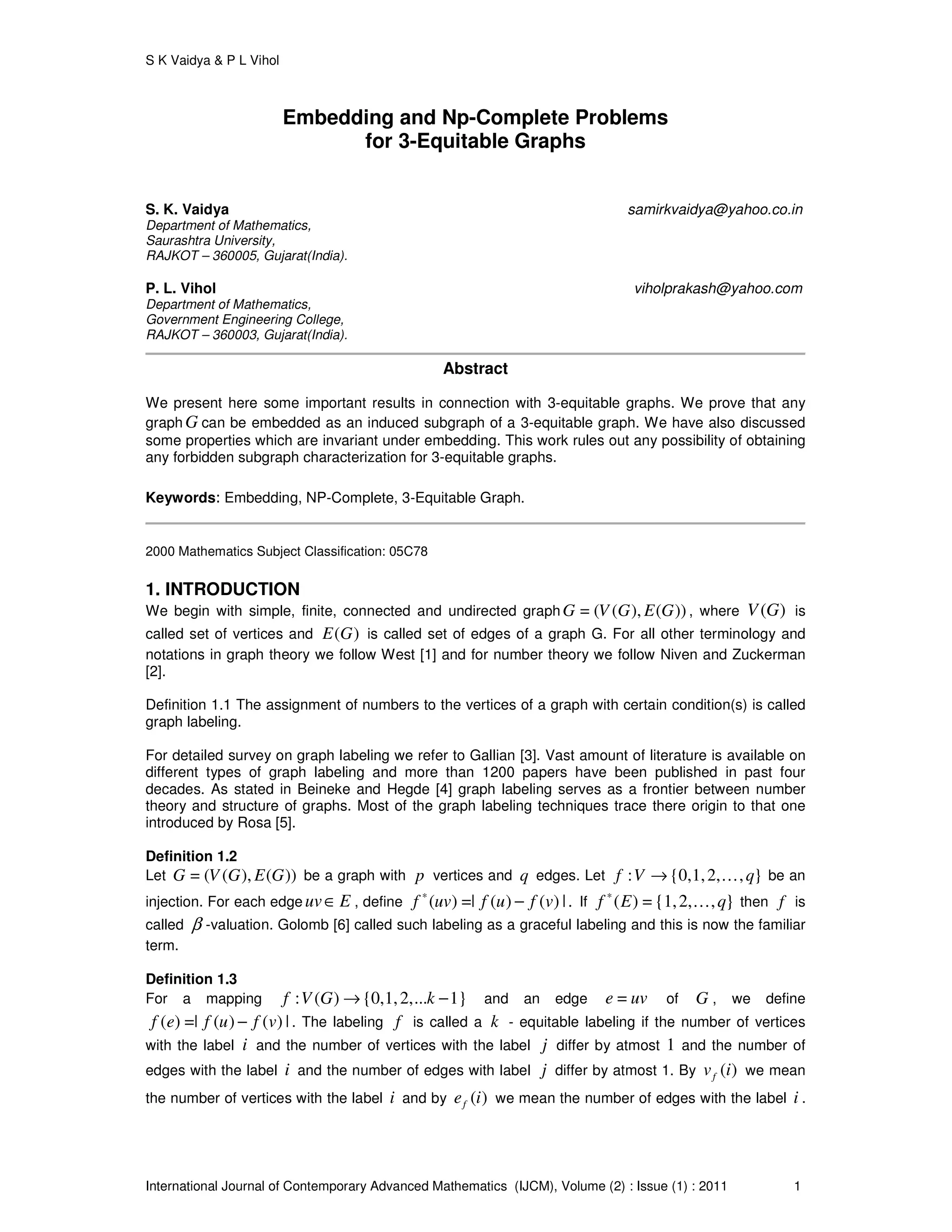 The document discusses significant findings related to 3-equitable graphs, demonstrating that any graph can be embedded as an induced subgraph of a 3-equitable graph. It details various graph labeling techniques and defines rules for constructing and characterizing such graphs, while also establishing that determining the chromatic number of 3-equitable graphs is NP-complete. The authors also explore four types of related problems in the realm of 3-equitable graph embeddings.