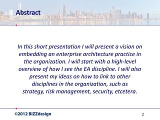This document discusses embedding enterprise architecture (EA) in an organization. It presents EA as a conceptual tool to help organizations understand their structure and operations. The document advocates linking EA to other disciplines like strategy, risk management, security, and project management. It also discusses how EA can be integrated with governance, human resources, and the implementation of strategic initiatives. The goal is to present a vision for establishing an EA practice that bridges concerns across an organization.