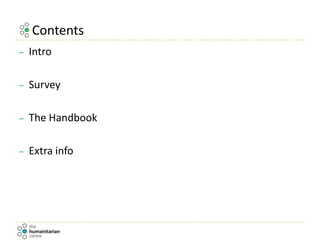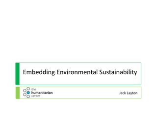 This document outlines the creation of an environmental handbook for making an office space more sustainable. It describes conducting a survey of staff to identify areas to focus on. It then details the development of the handbook, which provides guidance on topics like transportation, food, recycling, and administration to improve environmental practices through everyday actions and foster a culture of concern. The handbook is intended to save the planet, time, and money using a simple and effective approach communicated through various means like social media and emails.