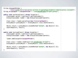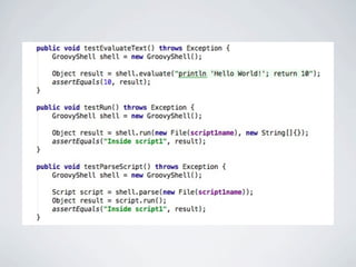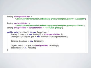 Il documento tratta l'integrazione di un interprete Groovy in un'applicazione Java, esaminando diverse tecniche di embedding quali l'uso di GroovyShell e GroovyClassLoader. Viene discussa la gestione delle dipendenze e delle classi, spiegando anche le prestazioni attraverso caching e reloading. Sono inclusi riferimenti a diverse risorse utili per approfondire l'argomento.