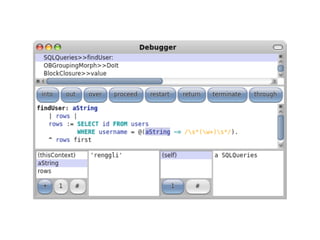 The document discusses techniques for embedding languages within host systems while maintaining tool integration and data abstraction. It elaborates on syntactic and semantic transformations using various language frameworks such as pidgin, creole, and argot. Key components include parsing, transformation rules, and the generation of executable code using traditional Smalltalk compiler methods.
