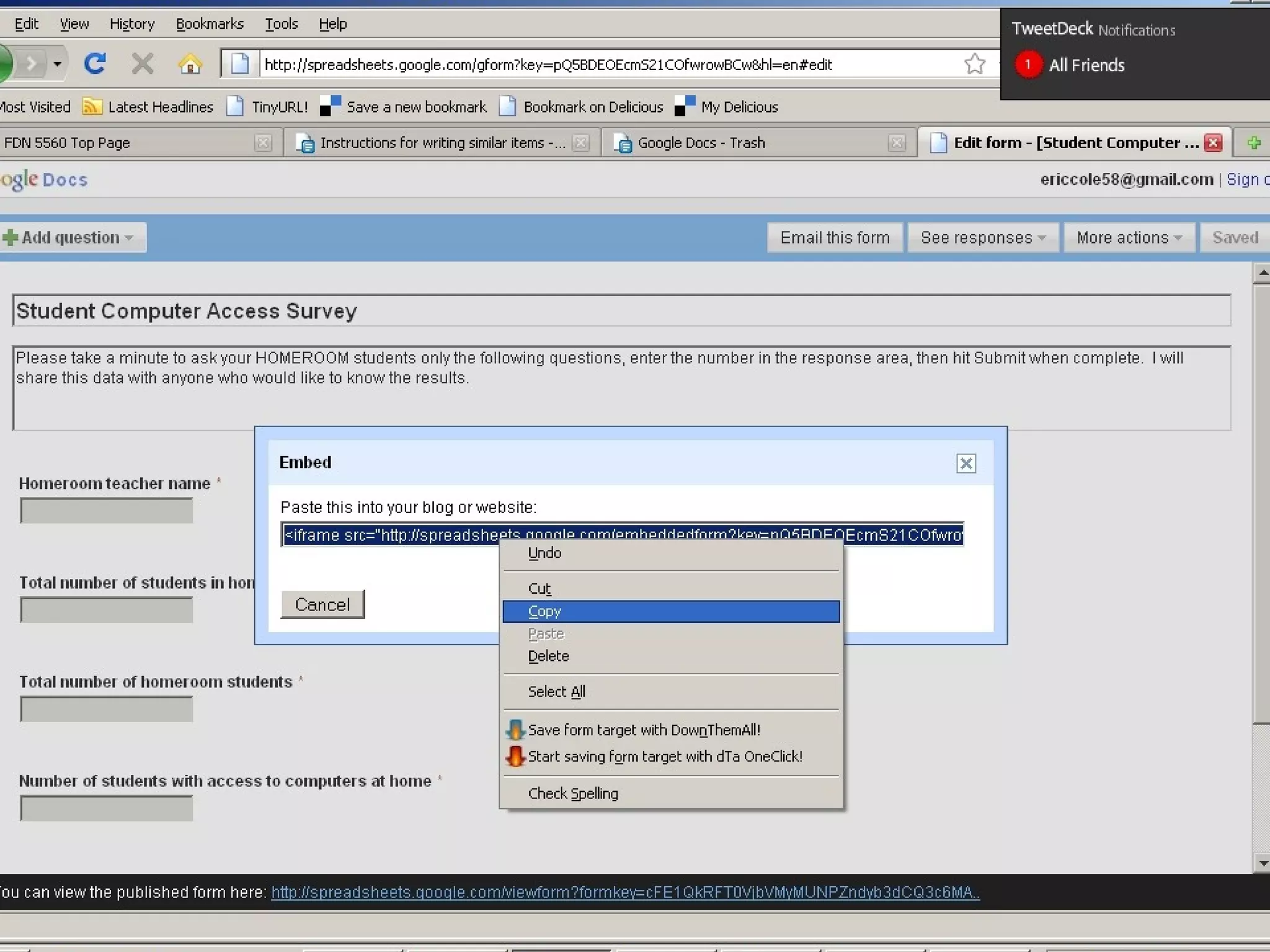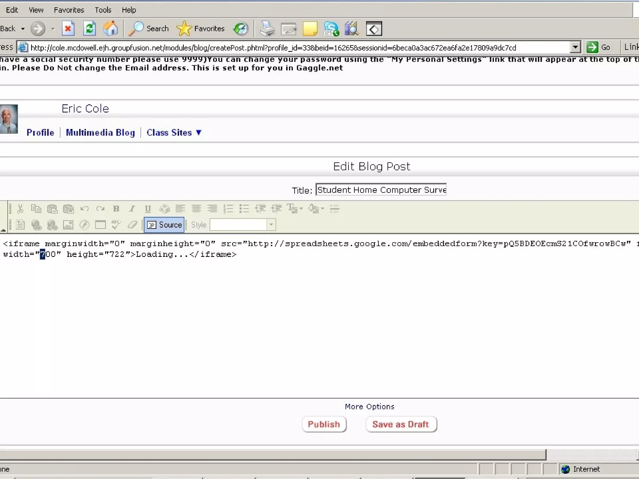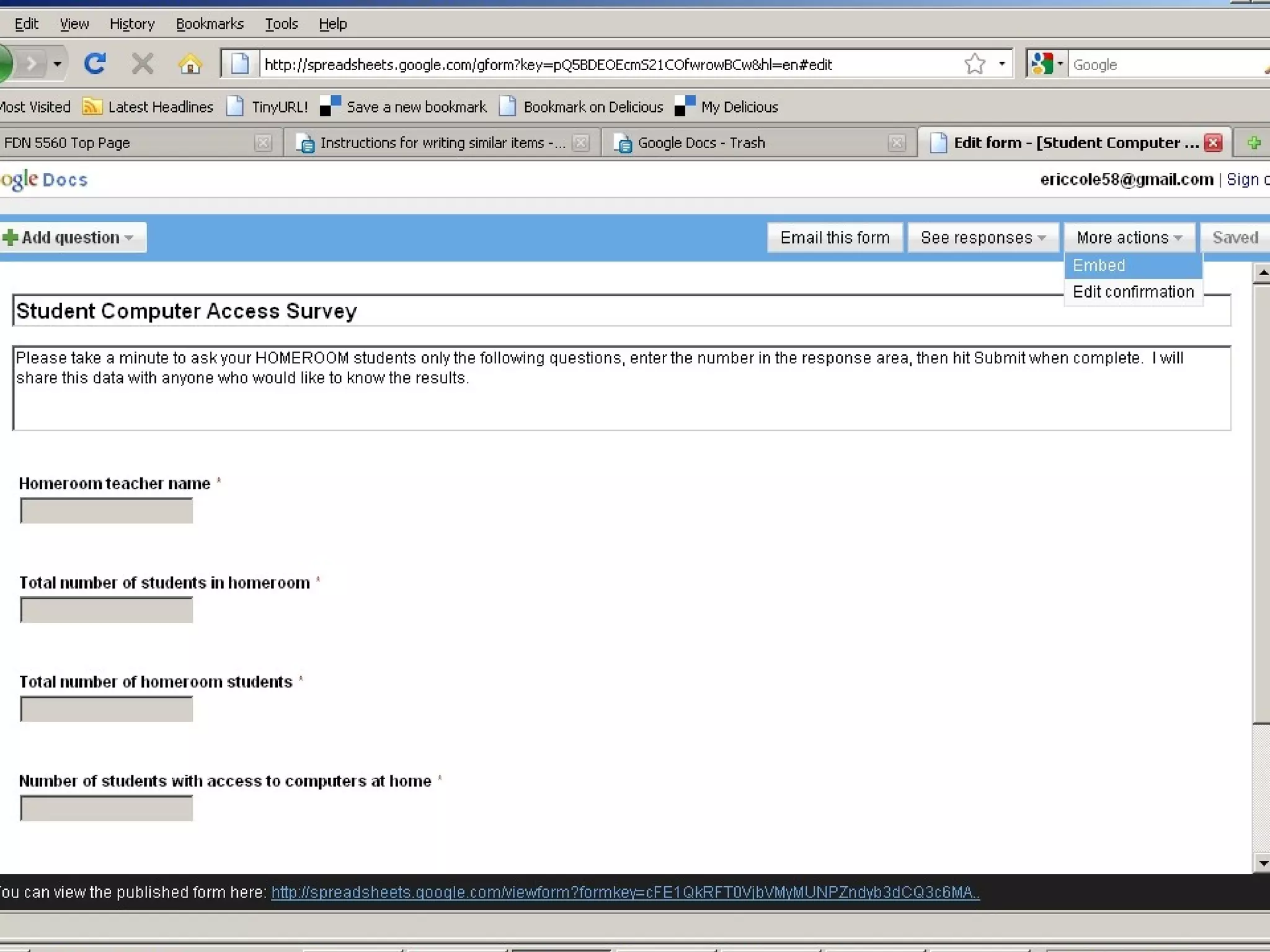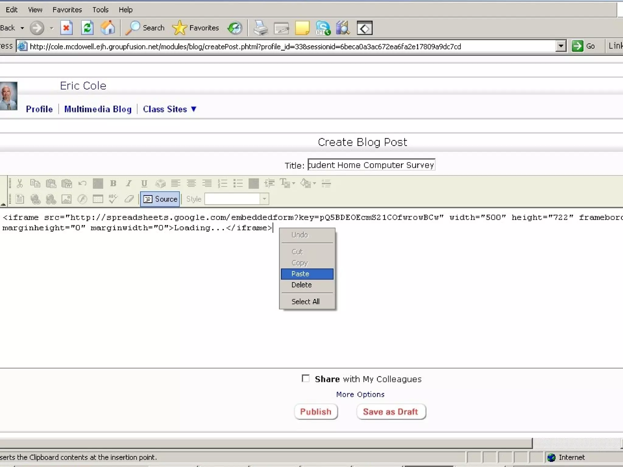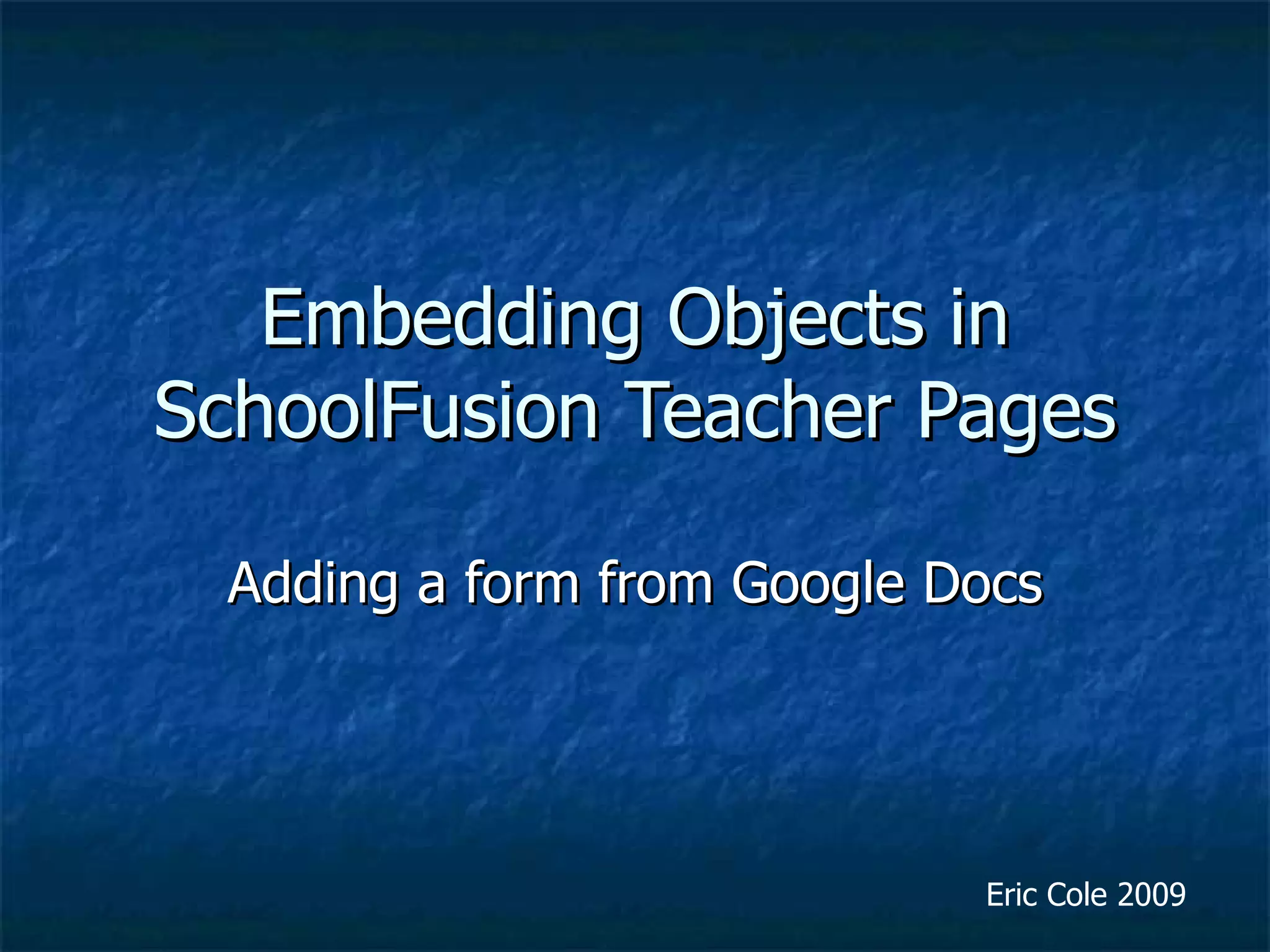 To embed a Google Form in a SchoolFusion teacher page: 1. Create the form in Google Docs and select "Embed" to copy the embed code. 2. In SchoolFusion, edit the HTML source of a new blog post and paste in the embed code. 3. Adjust the width and height of the embedded object and publish the blog post as a "Multimedia Blog" for the form to display. Any future form edits must be done in Google Docs, not directly in SchoolFusion.