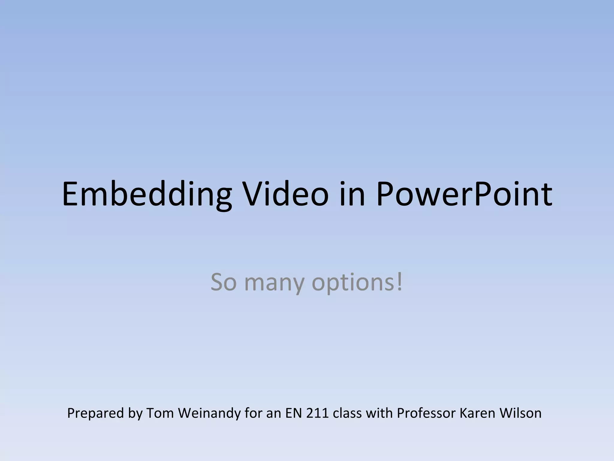 The document provides instructions on embedding videos in PowerPoint presentations, highlighting three options: inserting a saved file, embedding from the web, or downloading videos from YouTube. It emphasizes enabling macros for web embedding and mentions the need for a larger file size when downloading. The preparation was done by Tom Weinandy for an EN 211 class at JCU.