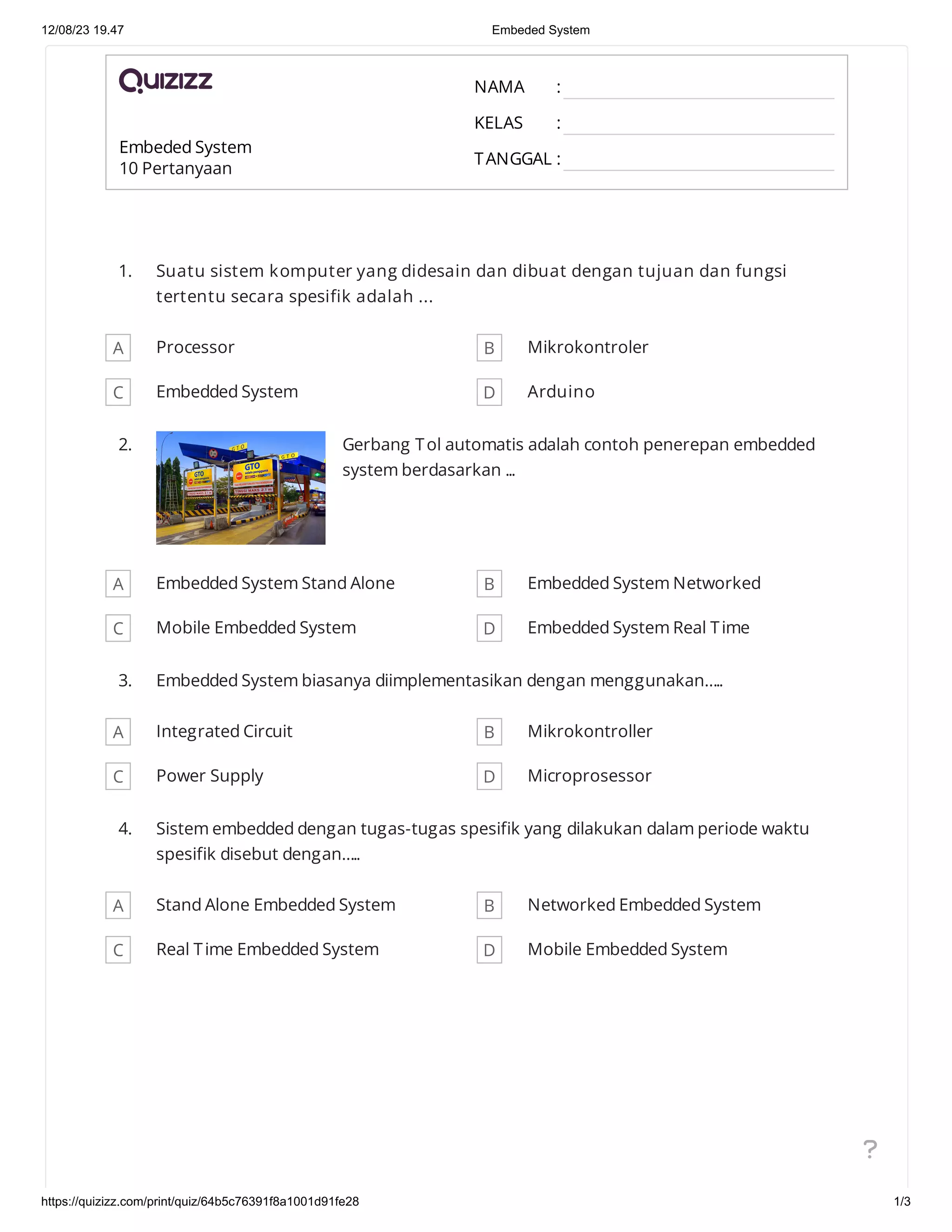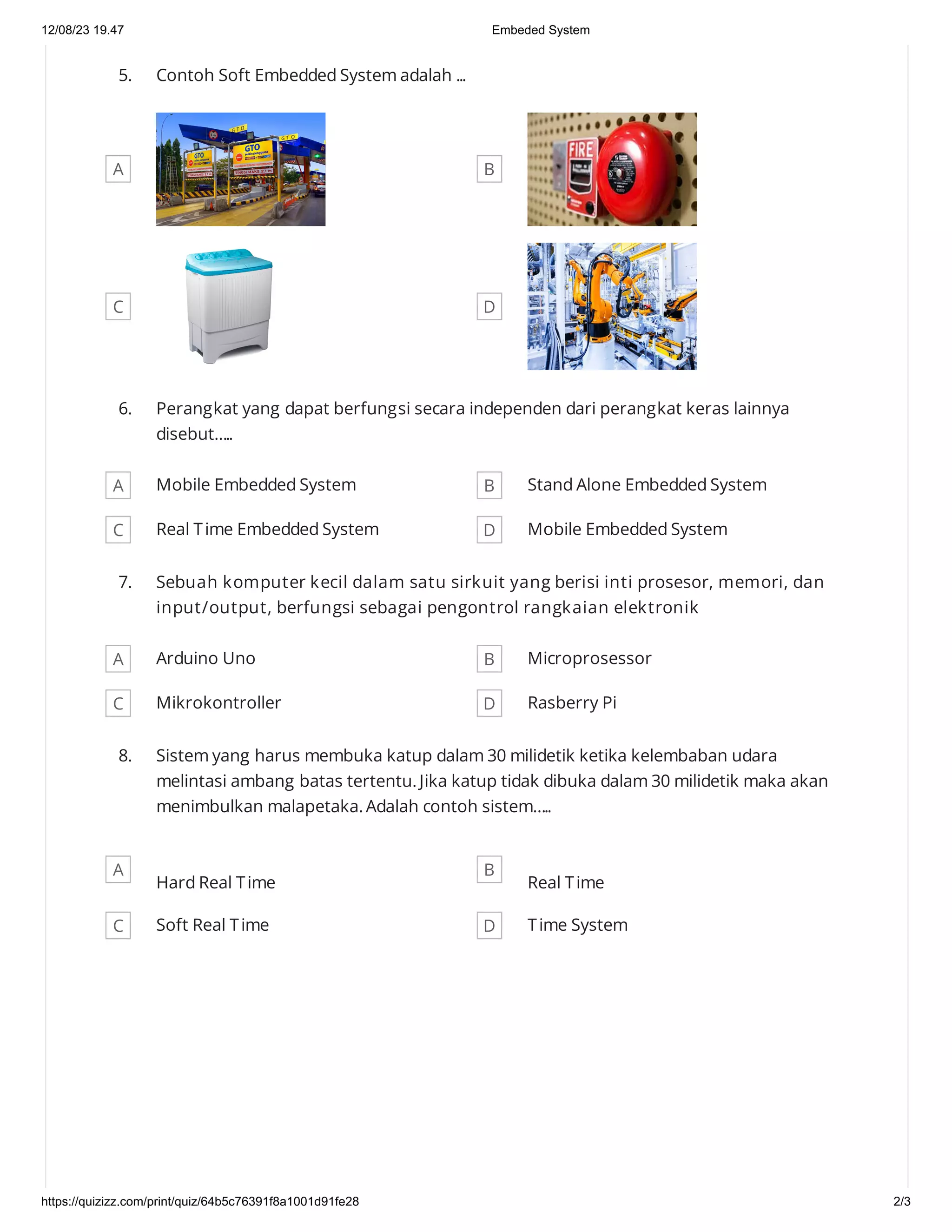 Dokumen tersebut memberikan pertanyaan-pertanyaan mengenai sistem terbenam (embedded system). Embedded system adalah sistem komputer yang dirancang untuk melakukan tugas-tugas spesifik secara otomatis. Contohnya adalah gerbang tol otomatis dan sistem pengontrol elektronik. Embedded system biasanya menggunakan mikrokontroler dan harus mampu menyelesaikan tugasnya dalam waktu tertentu.