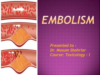 An embolism is the obstruction of a blood vessel by an embolus, which can be a thrombus, fat globule, air bubble, or foreign material, potentially leading to serious health issues like stroke or sudden death. Diagnosis and treatment vary based on the cause and location of the embolism, with options including embolectomy, thrombolysis, and lifestyle changes to reduce risk factors. Preventive measures include maintaining a healthy diet, exercising, quitting smoking, and managing health conditions such as high blood pressure and cholesterol.