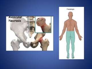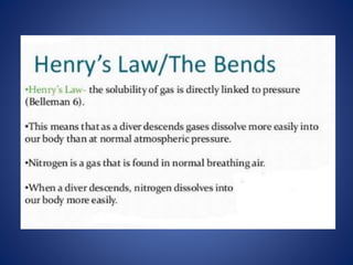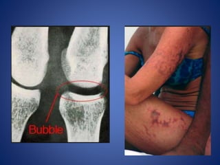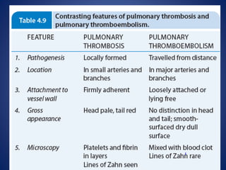 This document defines and describes different types of embolism. The most common type is thromboembolism, which occurs when a thrombus or part of a thrombus breaks off and is carried by the bloodstream. Pulmonary thromboembolism is a significant type that occurs when thrombi travel to the lungs and obstruct the pulmonary arteries. Other types include fat, air, gas and paradoxical embolisms. Air embolism can be venous, entering systemic veins during surgery or trauma, or arterial, entering the lungs during procedures like angiography. Decompression sickness is a form of gas embolism that affects divers or those exposed to changes in atmospheric pressure.