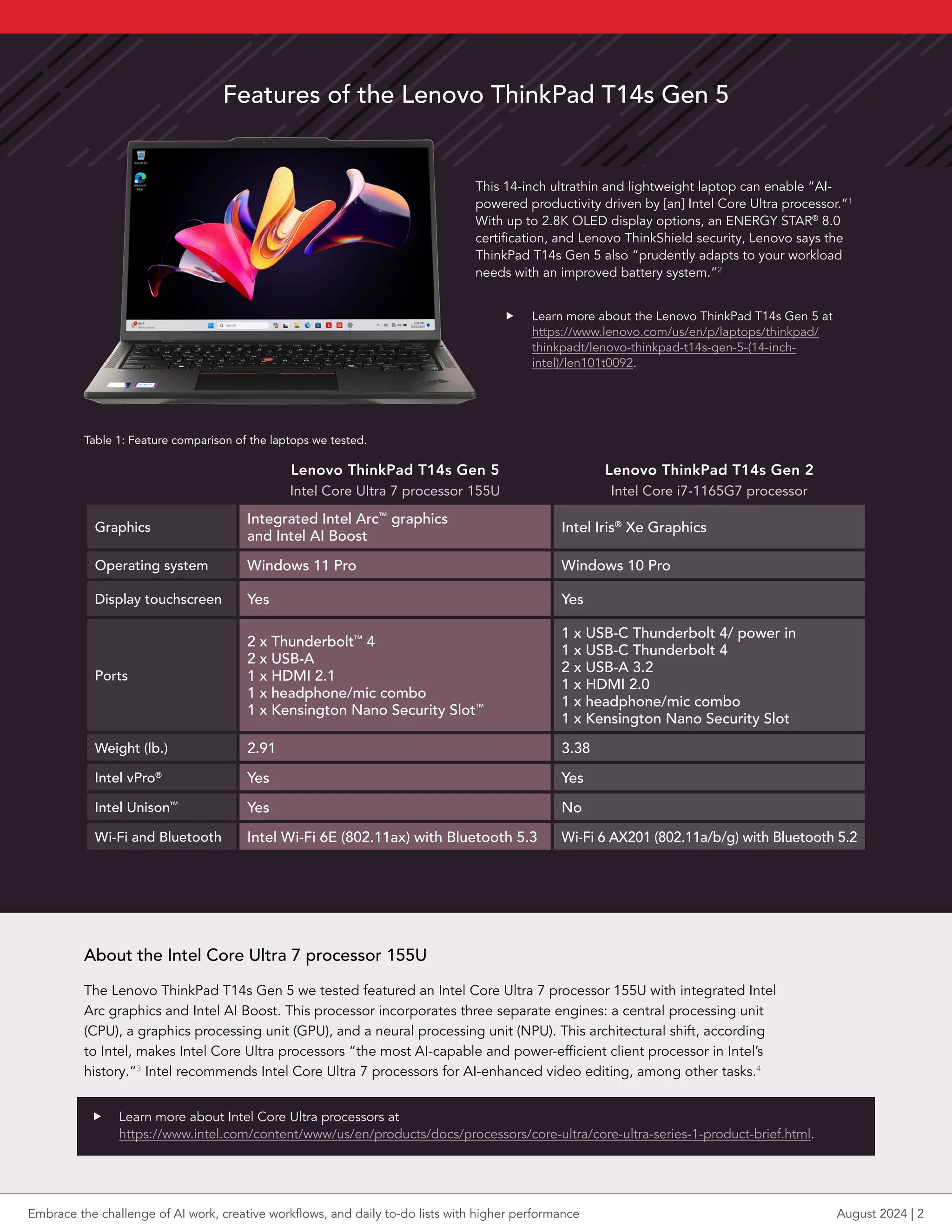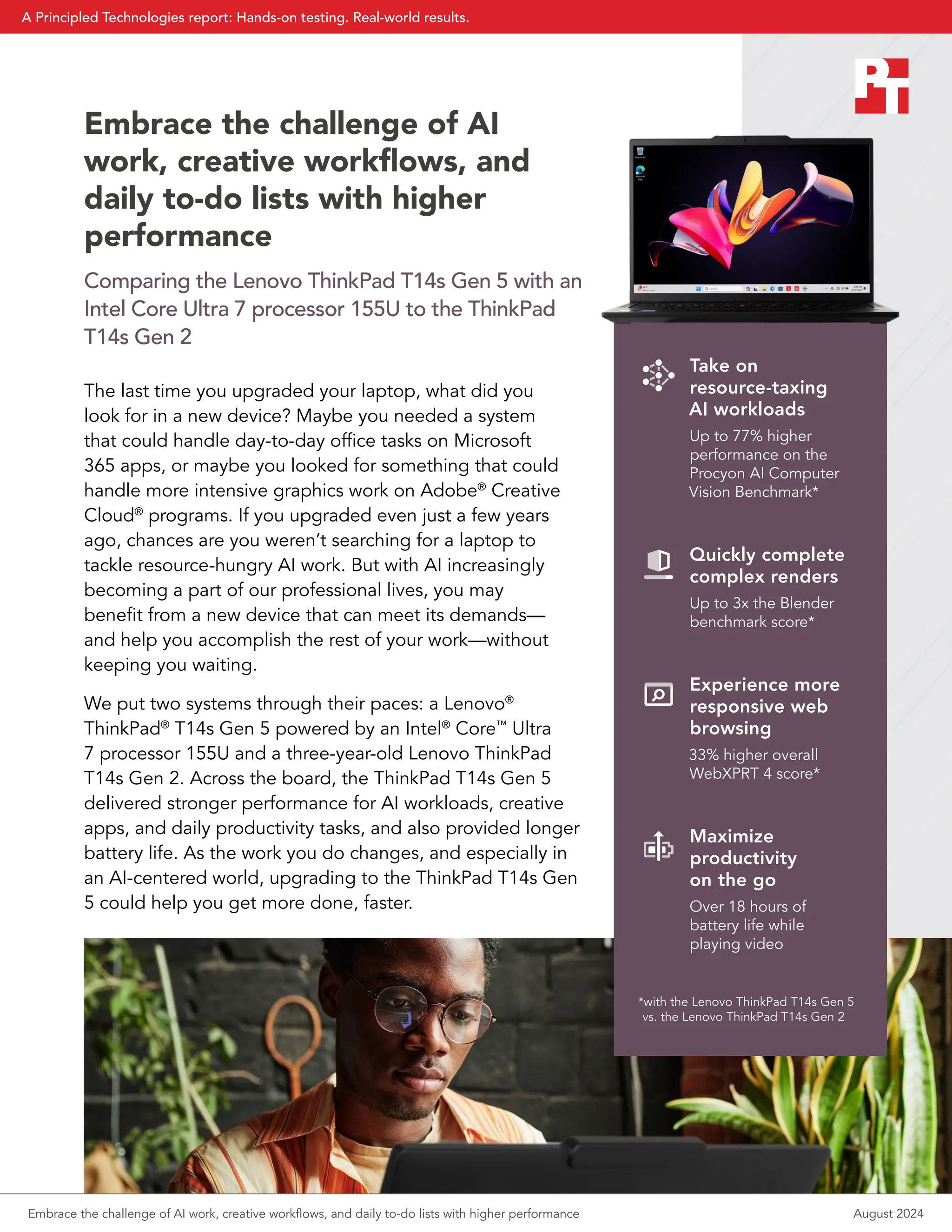 The document compares the Lenovo ThinkPad T14s Gen 5, equipped with an Intel Core Ultra 7 processor, to the older T14s Gen 2, highlighting significantly improved performance in AI workloads, creative applications, and everyday productivity tasks. The newer model boasts up to 77% higher performance in AI benchmarks, longer battery life exceeding 18 hours, and enhanced capabilities for creative workflows with tools like Adobe Creative Cloud. Overall, upgrading to the ThinkPad T14s Gen 5 is recommended for professionals seeking a powerful and efficient laptop in an increasingly AI-focused workplace.