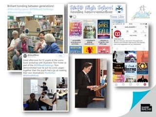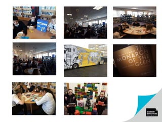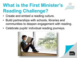 The First Minister's Reading Challenge (FMRC) aims to promote reading for pleasure in schools, libraries, and communities in Scotland. It is open to students in primary grades P4-7 and now also includes a secondary school pilot program. The document discusses several successful initiatives undertaken by Renfrew High School to engage students in reading through their school library as part of the FMRC secondary school pilot program. These initiatives included special events for Book Week Scotland, a gift book project, author visits, and a graphic novel project to promote the school's history. Evaluations found that the initiatives helped create a reading for pleasure culture and increased student engagement with the school library.