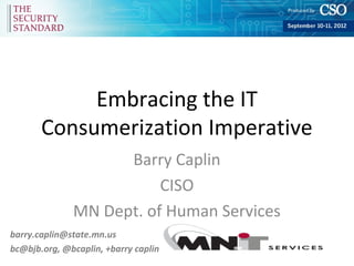 Barry Caplin, CISO of the MN Dept. of Human Services, discusses embracing consumerization and the security challenges of tablets and smartphones. He outlines the rapid adoption of these devices and consumer apps. Some key security risks include exposure of data, malware, lack of vetting and updates for third party apps, and privacy issues. Caplin provides an overview of potential technical solutions like mobile device management, virtualization, and containerization as well as the importance of policy, legal considerations, and user education when implementing a BYOD or mobile strategy.