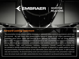 Embraer reported its first quarter 2014 earnings results, with net revenues of $2.3 billion and net income of $267 million. The company delivered 14 commercial jets, 20 executive jets, and saw continued growth in its order backlog which reached $19.2 billion. Embraer expects full year 2014 net revenues between $6.0-6.5 billion and net income margin of around 9%.