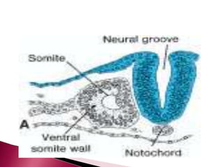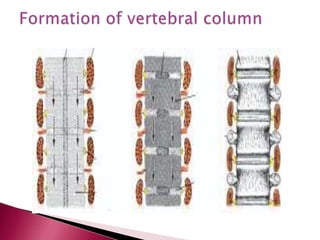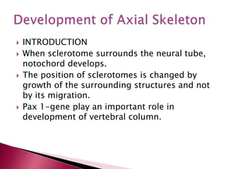 The document discusses the development of the vertebral column and ribs from sclerotome portions of somites. Sclerotome cells migrate and resegment to form vertebrae consisting of vertebral bodies and processes. Intervertebral discs form from mesenchymal cells between vertebrae. Defects like scoliosis can occur if vertebrae fuse asymmetrically. Ribs derive from sclerotome and cartilage, while the sternum develops from lateral plate mesoderm fusing in the midline, and may exhibit defects like cleft sternum.
