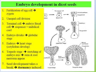 This document discusses the development of embryos in plants. It defines an embryo as a fertilized zygote or oospore that develops. There are 5 types of embryo development in angiosperms based on the role of the proembryo cells: 1) Crucifer type where the basal cell plays little role, 2) Asterad type where the basal and terminal cells are important, 3) Solanad type where the basal cell forms a suspensor, 4) Caryophyllod type where the basal cell divides, and 5) Chenopodiad type where both cells participate. It also describes the detailed development of embryos in Capsella bursa-pastoris and Luzula.