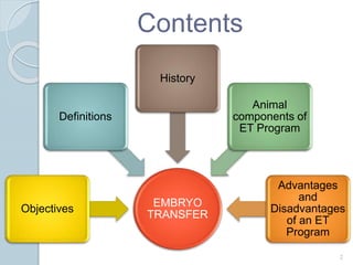 2) The history of embryo transfer began in the 1890s with early successful transfers between different animal species in later decades. Today it is commonly used in cattle breeding programs.