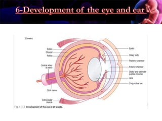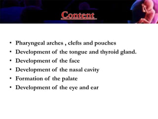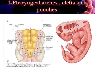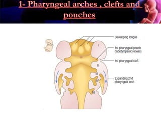 1) The head and neck develop from pharyngeal arches, clefts and pouches which form structures like the tongue, thyroid gland and face.