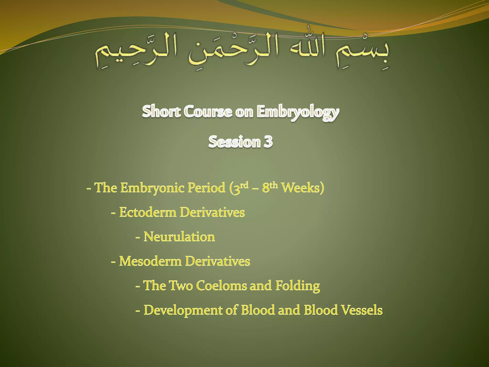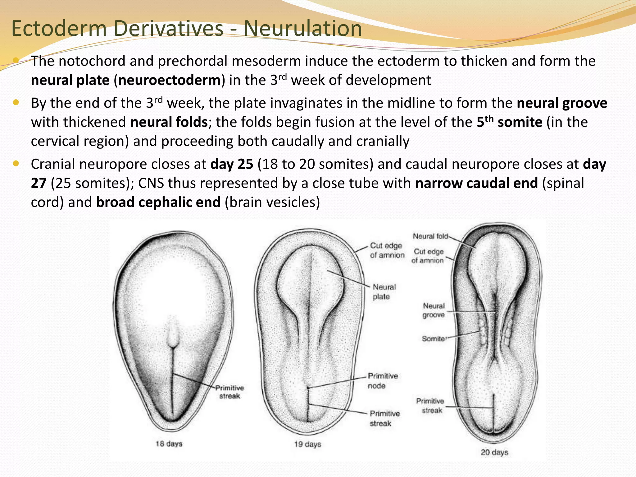 The document discusses the processes of neurulation and mesoderm differentiation in embryonic development, detailing the formation of the neural tube and the migration of neural crest cells. It describes the development of ectoderm and mesoderm derivatives, such as the formation of body cavities and the cardiovascular system. Additionally, it outlines the roles of somites and their contributions to musculature and the vertebral column.