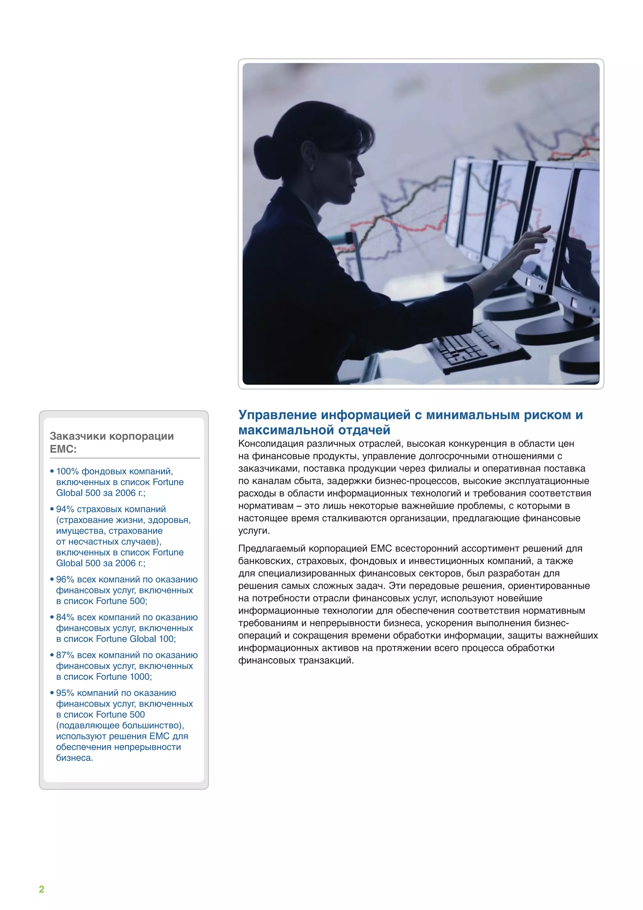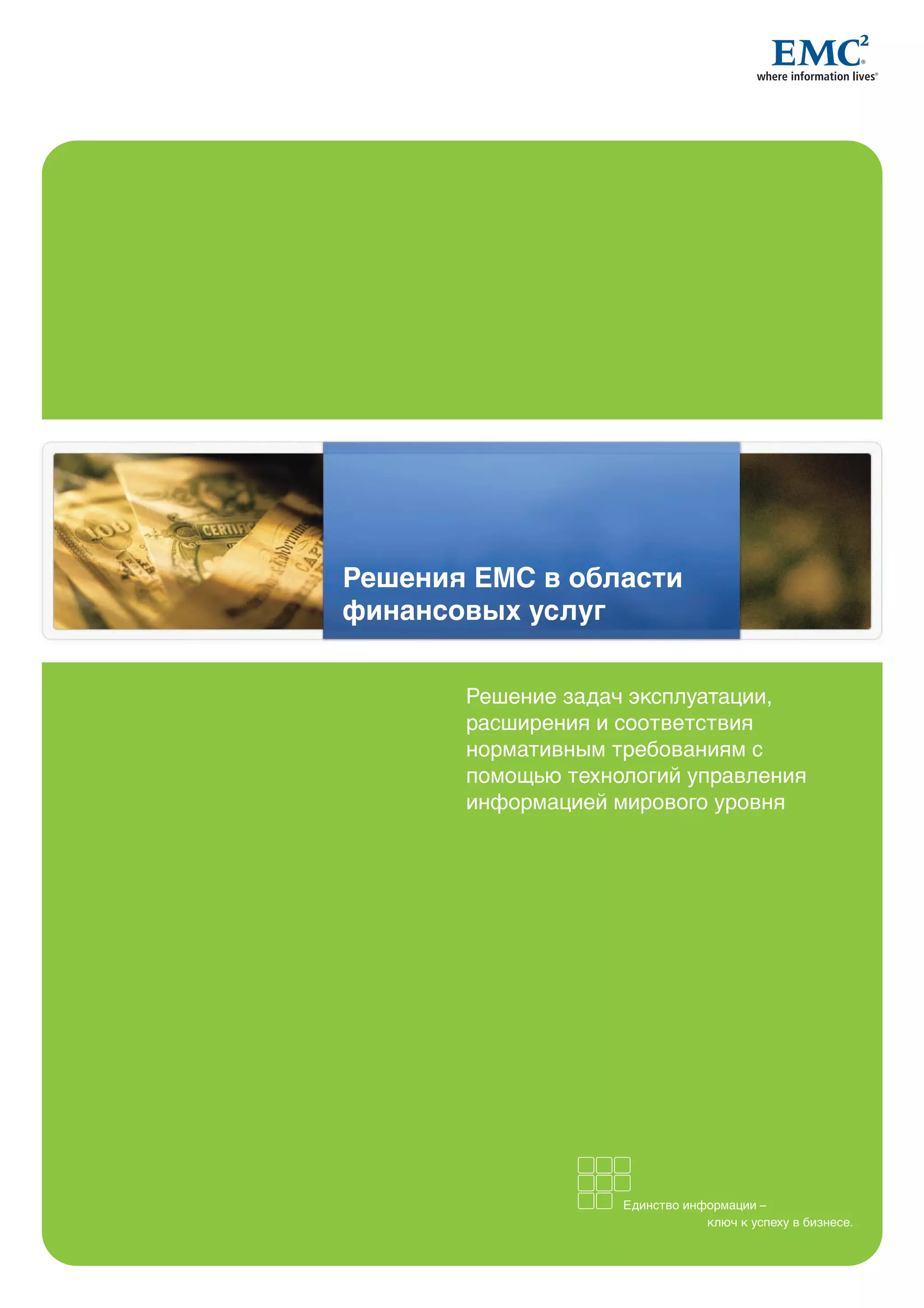 Корпорация EMC предлагает решения для финансовых услуг, которые помогают организациям соблюдать нормативные требования, улучшать бизнес-процессы и оптимизировать управление информацией. Эти решения включают в себя технологии для банковского, страхового и инвестиционного секторов, а также обеспечивают защиту и непрерывность бизнеса. EMC успешно обслуживает большинство крупных финансовых учреждений, предлагая лучшие в отрасли технологии и консультационные услуги.
