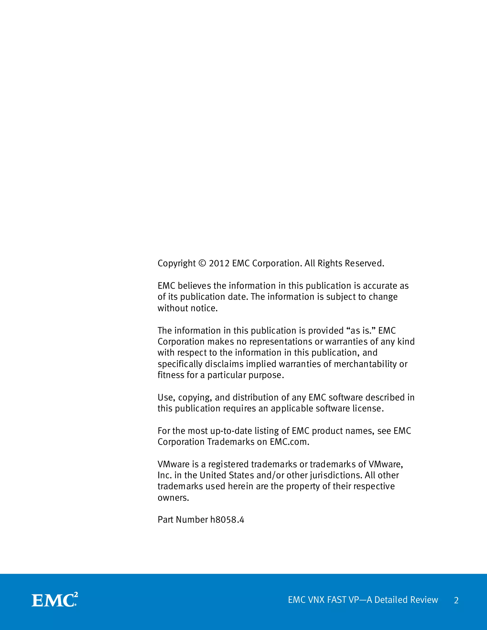 This white paper reviews the EMC® Fully Automated Storage Tiering for Virtual Pools (Fast VP) technology, outlining its features, implementation, and benefits for users. Fast VP enables dynamic storage-tiering to optimize data placement according to activity levels, thereby reducing total cost of ownership and enhancing storage performance. The document details technical specifications, management strategies, and best practices for deploying Fast VP within different EMC storage systems.