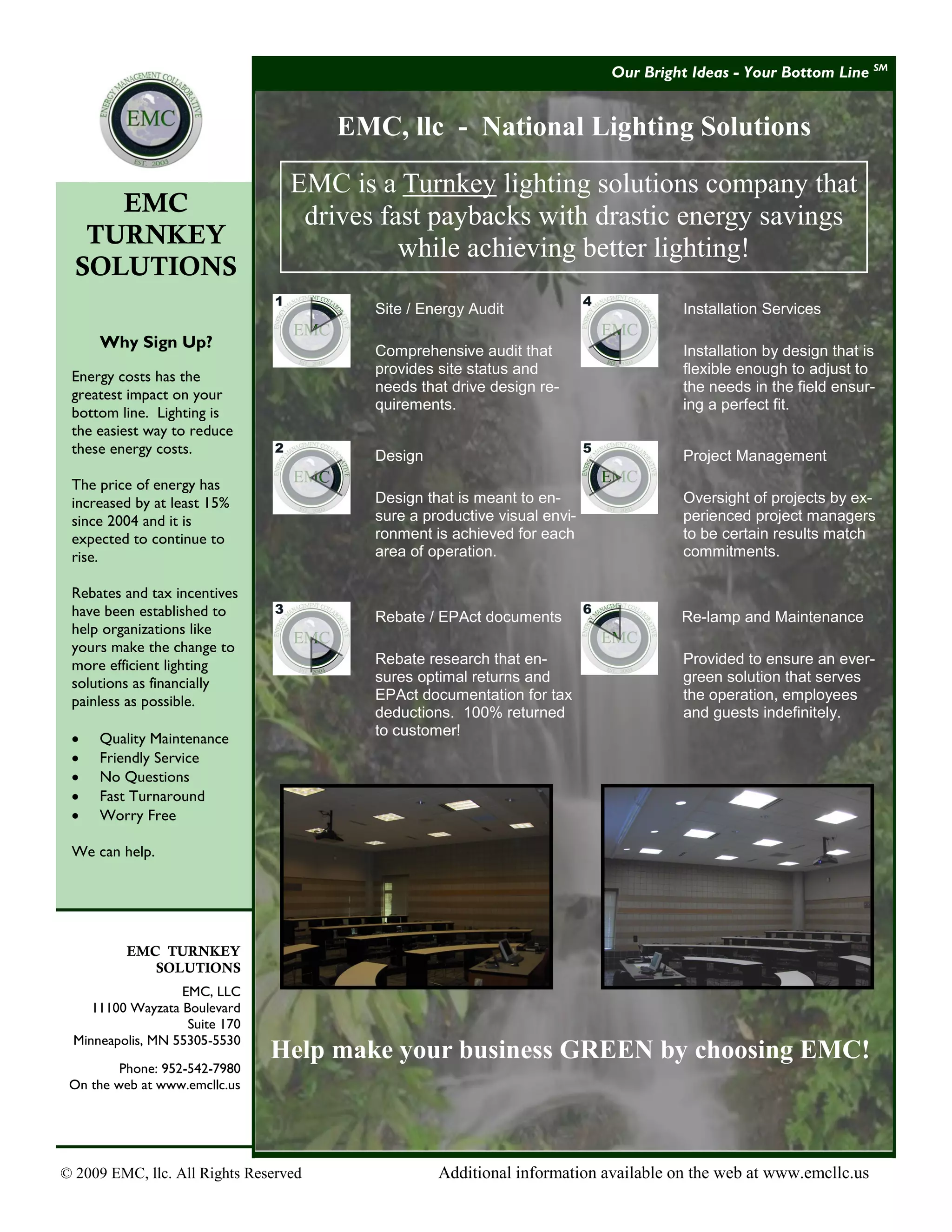 EMC is a lighting solutions company that performs energy audits and designs, installs, and maintains energy-efficient lighting systems to help businesses reduce their energy costs and increase savings. They provide a full-service turnkey solution including an audit to assess needs, design of a new lighting layout, installation, obtaining rebates, and ongoing maintenance to ensure the system continues delivering savings over time. Choosing EMC can help lower a business's energy bills which have increased 15% since 2004 and are expected to continue rising through optimized lighting solutions.