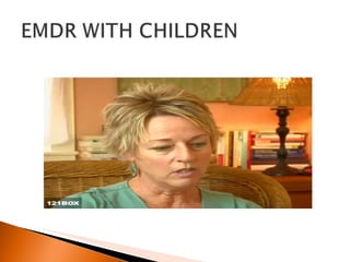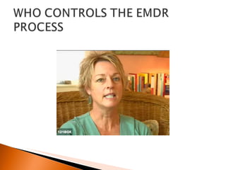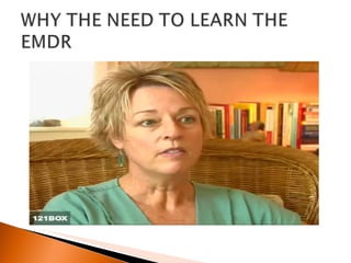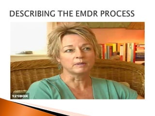 Eye movement desensitization and reprocessing (EMDR) is a form of psychotherapy used to treat post-traumatic stress disorder (PTSD) by processing traumatic memories. It was developed by Francine Shapiro and uses eye movements combined with recalling a traumatic memory to reduce the emotional intensity of that memory. The therapy process involves identifying a disturbing memory or event, developing negative and positive beliefs about it, and using sets of eye movements while focusing on the memory to install the positive beliefs. EMDR addresses past, present and future aspects of traumatic memories over multiple therapy sessions to fully process the memory.