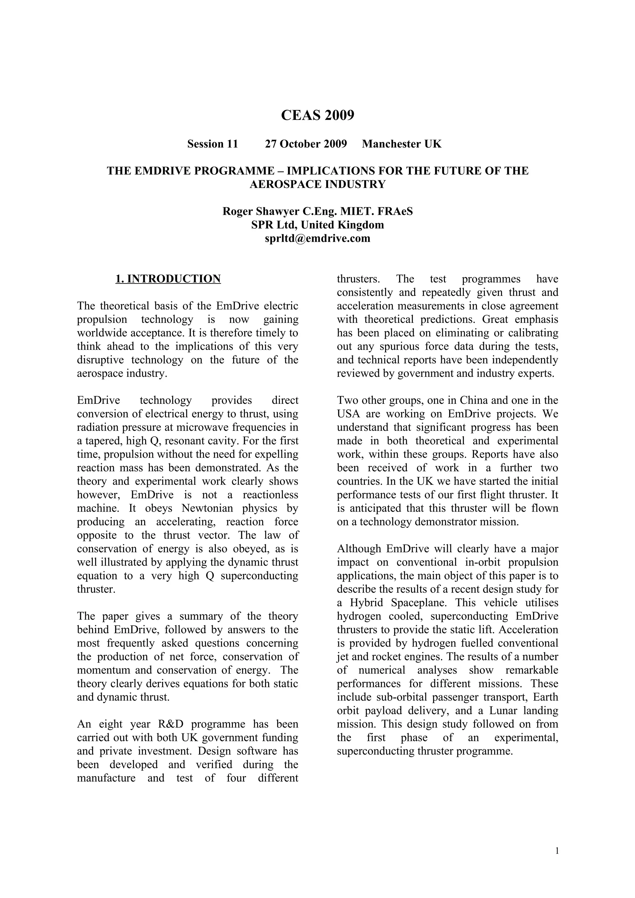 This document summarizes the EmDrive technology, which aims to provide propulsion without expelling reaction mass by converting electrical energy to thrust using radiation pressure in a resonant cavity. It provides: