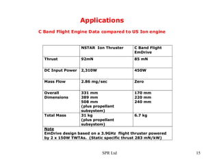 3. EmDrive EmDrive is the first technology to provide direct conversion of electrical energy to thrust, without the need for reaction mass , and without contravening the laws of physics Prototype C Band Thruster