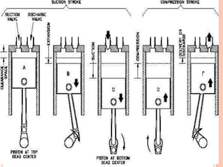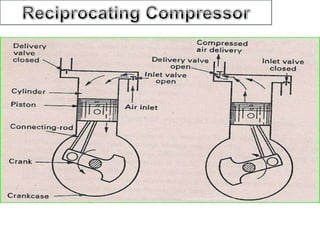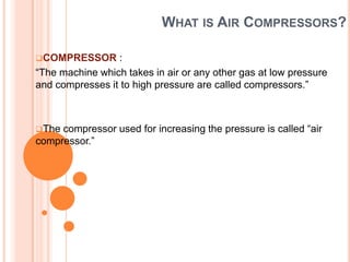 The document provides an overview of air compressors, defining them as machines that compress air or gas from low to high pressure. It discusses various types of compressors, including reciprocating, rotary, and multistage compressors, along with their operational principles, advantages, and efficiency metrics. Additionally, it covers specific applications of compressed air across different industries and explains key concepts such as indicated power, brake power, and volumetric efficiency.