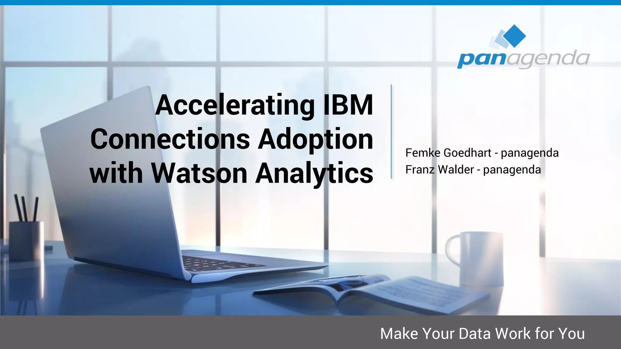 The document discusses strategies for improving adoption of IBM Connections through analytics, focusing on enterprise engagement and iterative processes. Key concepts include understanding user motivation, creating tailored adoption plans, and leveraging analytics for insights on usage and community dynamics. Watson Analytics is highlighted as a valuable tool for data integration, analysis, and visualization to support these efforts.