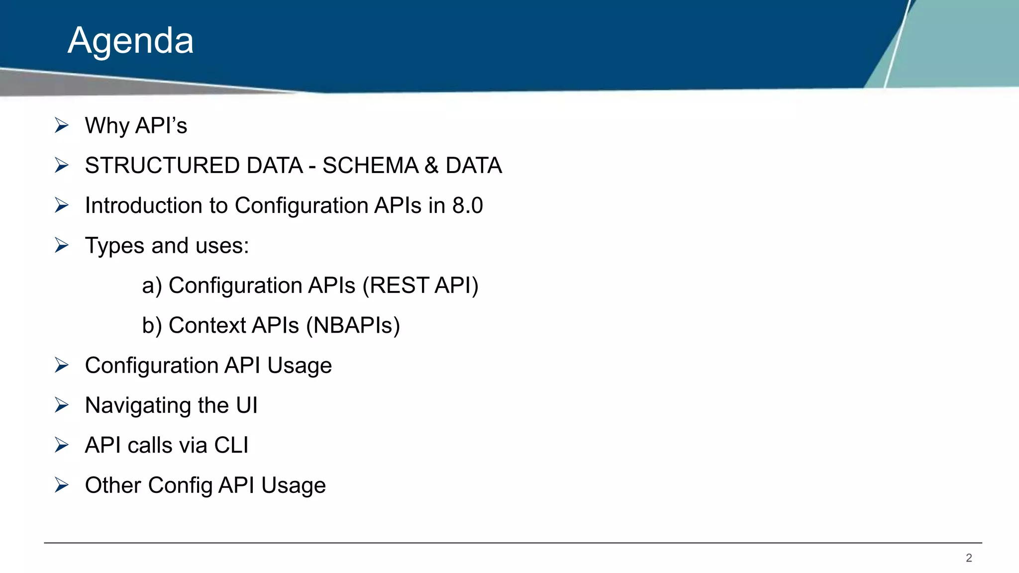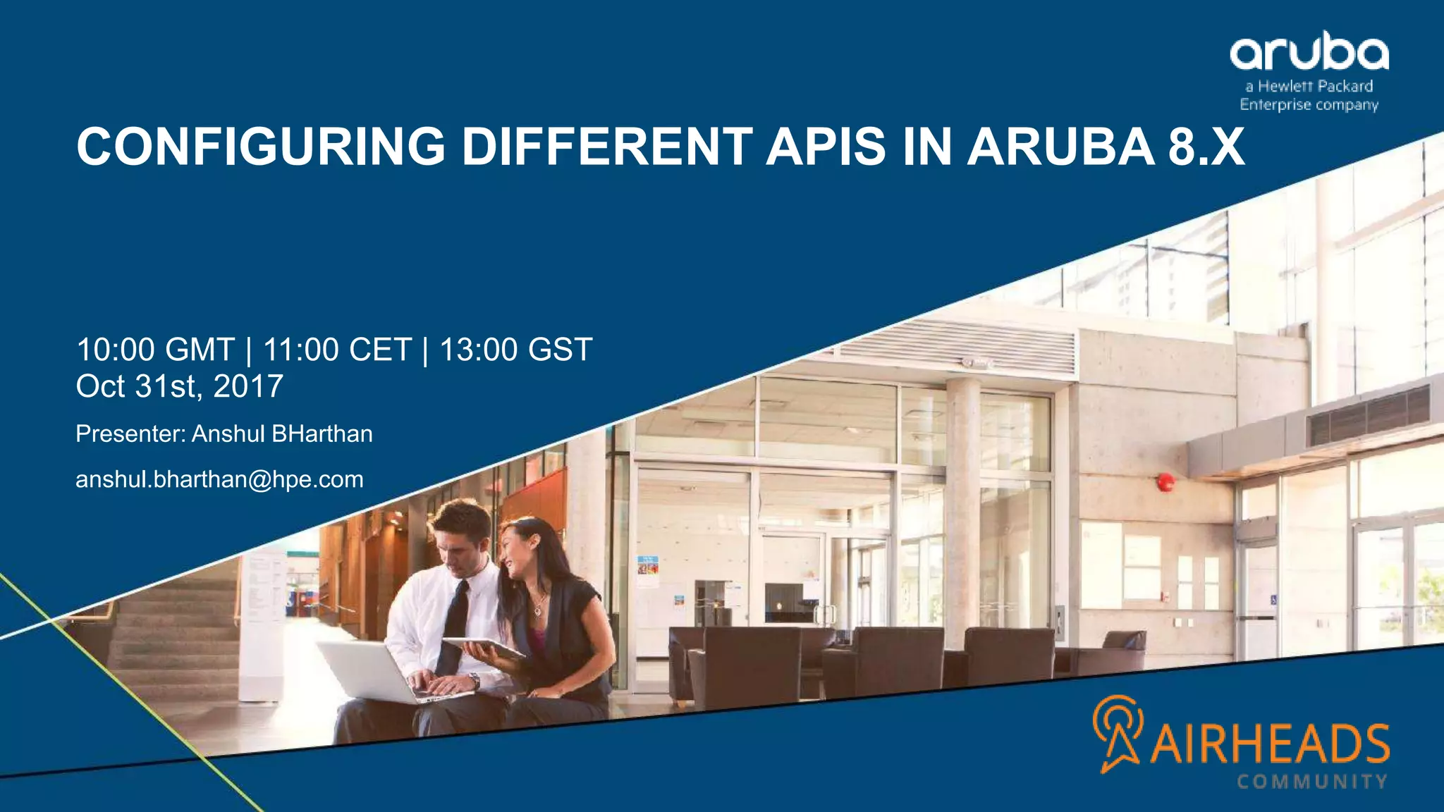 The document discusses configuring different APIs in Aruba 8.x. It provides an overview of configuration and context APIs, including REST APIs and NBAPIs. It describes using APIs to get and set configuration parameters via the GUI, CLI, and curl commands. Examples are given of retrieving data via show commands and posting multiple configuration objects at once. The role of the NBAPI helper process in handling location context data is also summarized.