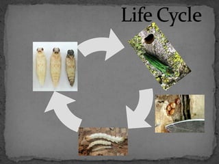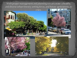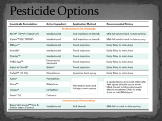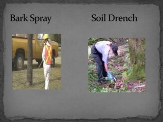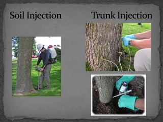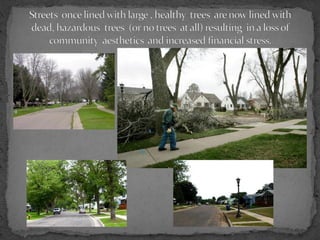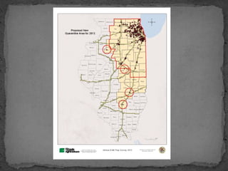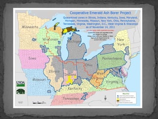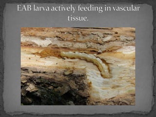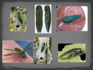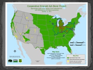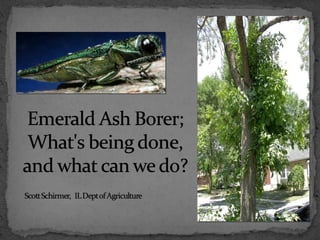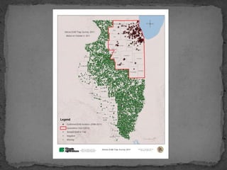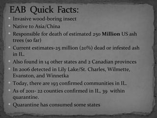 This document discusses the emerald ash borer, an invasive wood-boring insect from Asia that has killed an estimated 250 million ash trees in the United States. It has spread to 14 states and 2 Canadian provinces, infecting over 20% of ash trees in Illinois. The larval stage tunnels through tree vascular tissue, cutting off water and nutrients. Heavily infested areas have seen ash tree regeneration cease. Integrated approaches involving insecticide treatments, biological controls, and tree removals may help manage the spread. Factors like ash population density and tree species influence management strategies.