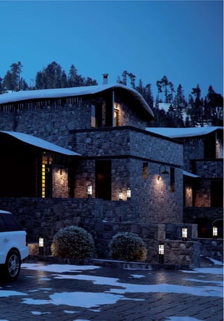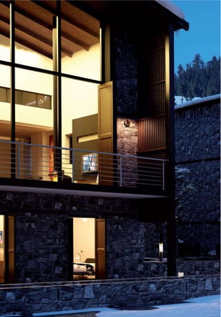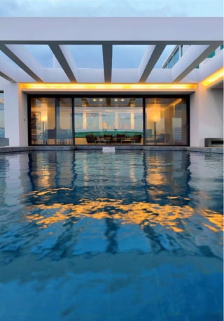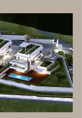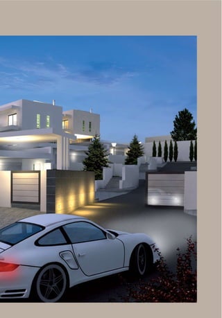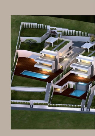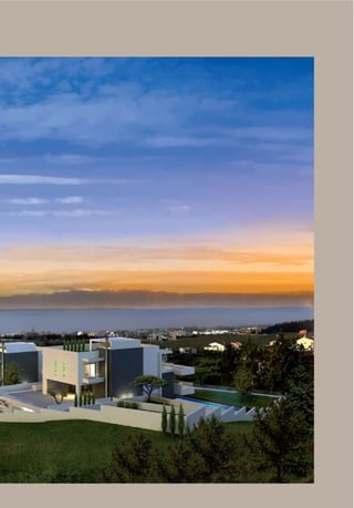 This document describes Emerald Villas, luxury homes located in Thessaloniki, Greece. The homes feature exquisite architecture on private land overlooking Thermaikos Bay. At 850 square meters with over 2,000 square meters of land, each home provides modern amenities and state-of-the-art technology for comfort and convenience including smart home automation, multimedia systems, and eco-friendly energy features like solar panels and a heat pump. Security systems ensure privacy and safety at the high-end residences.