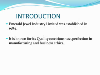 The document is a case study report submitted by the Young Creators team from Vickram College of Engineering about Emerald Jewelry. It discusses Emerald as the largest jewellery manufacturer in SAARC countries, exporting products to Dubai, UK, and USA. The guiding force is Mr. K. Srinivasan, the managing director with 25 years of experience in the jewellery manufacturing industry.