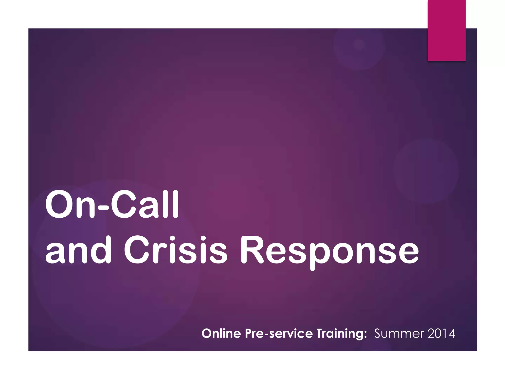 This document provides training for resident advisors on responding to after-hours incidents. It outlines the roles and responsibilities at different response levels from RAs to directors. RAs are the initial responders and follow a 3 step process: address the primary issue, provide community support, and document the incident. Higher levels like SOCs and directors provide escalating levels of support. RAs are told to remain calm, work with residents, use their resources, and call supervisors if unsure how to respond to an issue.